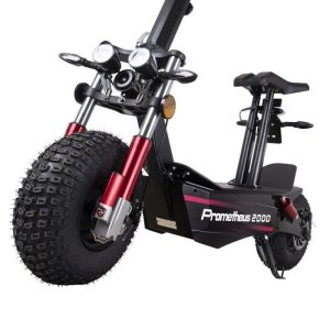 Trottinette électrique Prometheus avec siège de type homologué, pouvant atteindre 45 km/h. La batterie au plomb de 48 V tient sur une distance de 25 km, avec un moteur puissant de 2000 Watts.