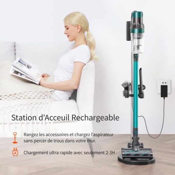 Après l’utilisation, vous pouvez arranger l’aspirateur et les accessoires sur la station d’accueil. Il n’occupe aucun espace. Vous pouvez ranger l’aspirateur balai sans perce le mur.